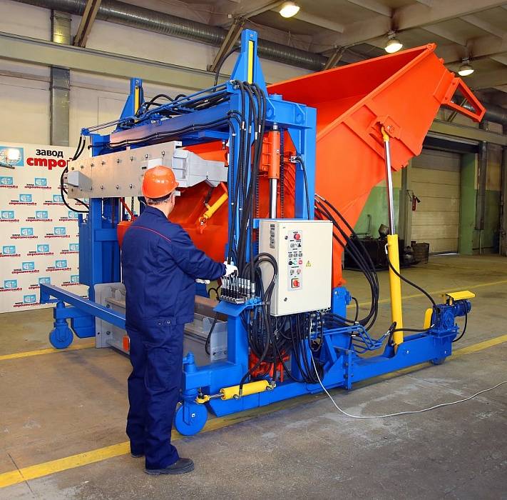Работа оператора вибропресса заключается лишь в управлении всеми процессами через 2 удобных пульта. Он последовательно загружает готовую смесь в виброформу, разравнивая её путем использования вибрации. Затем при помощи другого пульта выполняется формовка самого блока. Пульты расположены в 5 сантиметрах друг от друга. Перемещение вибропресса также происходит при помощи пульта.